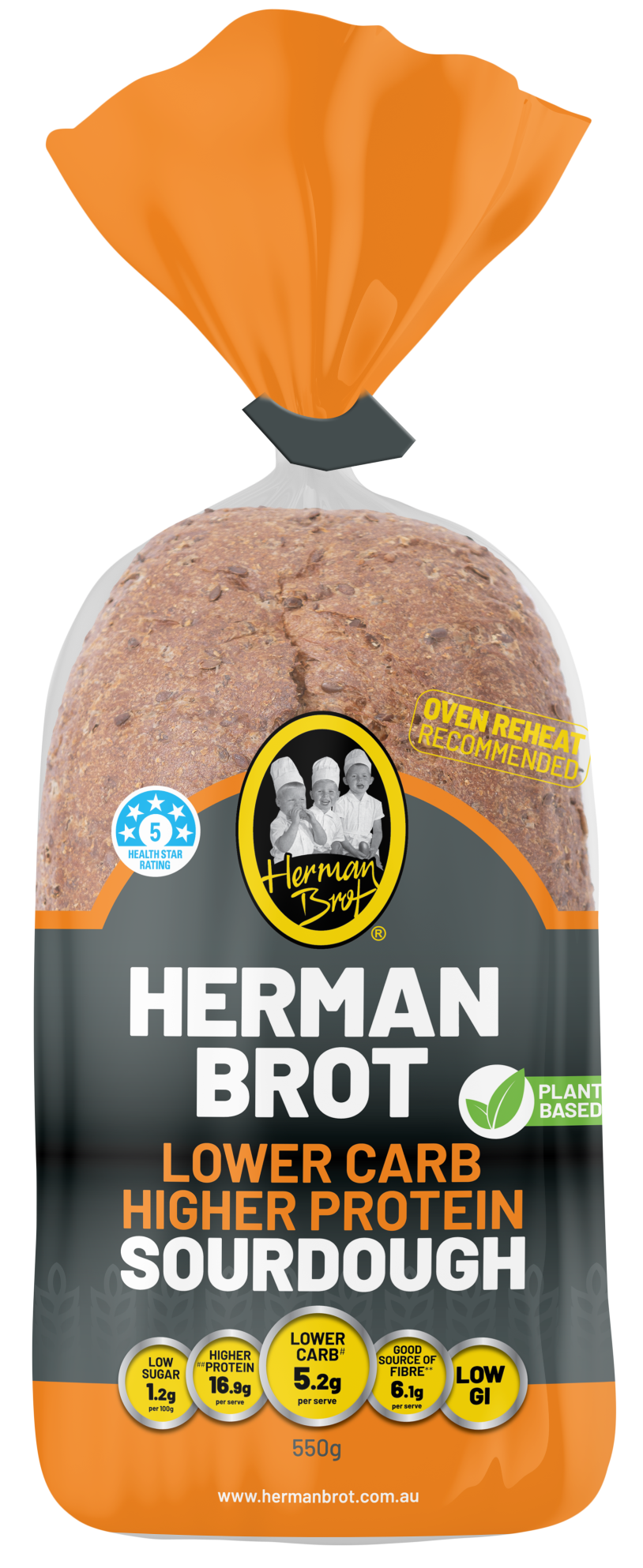 Herman Brot’s Lower Carb SOURDOUGH BREAD is one of the lowest carb Sourdough breads on the market. With only 5.2g carbs per serve and 16.9g protein per serve, this bread is also Low GI.